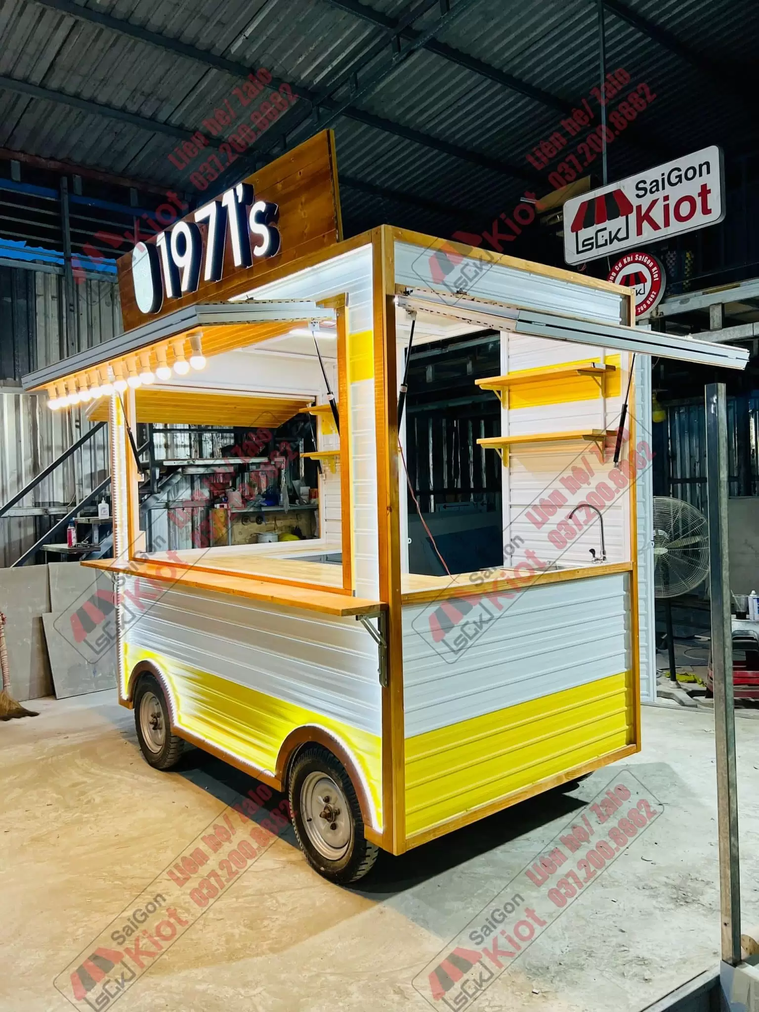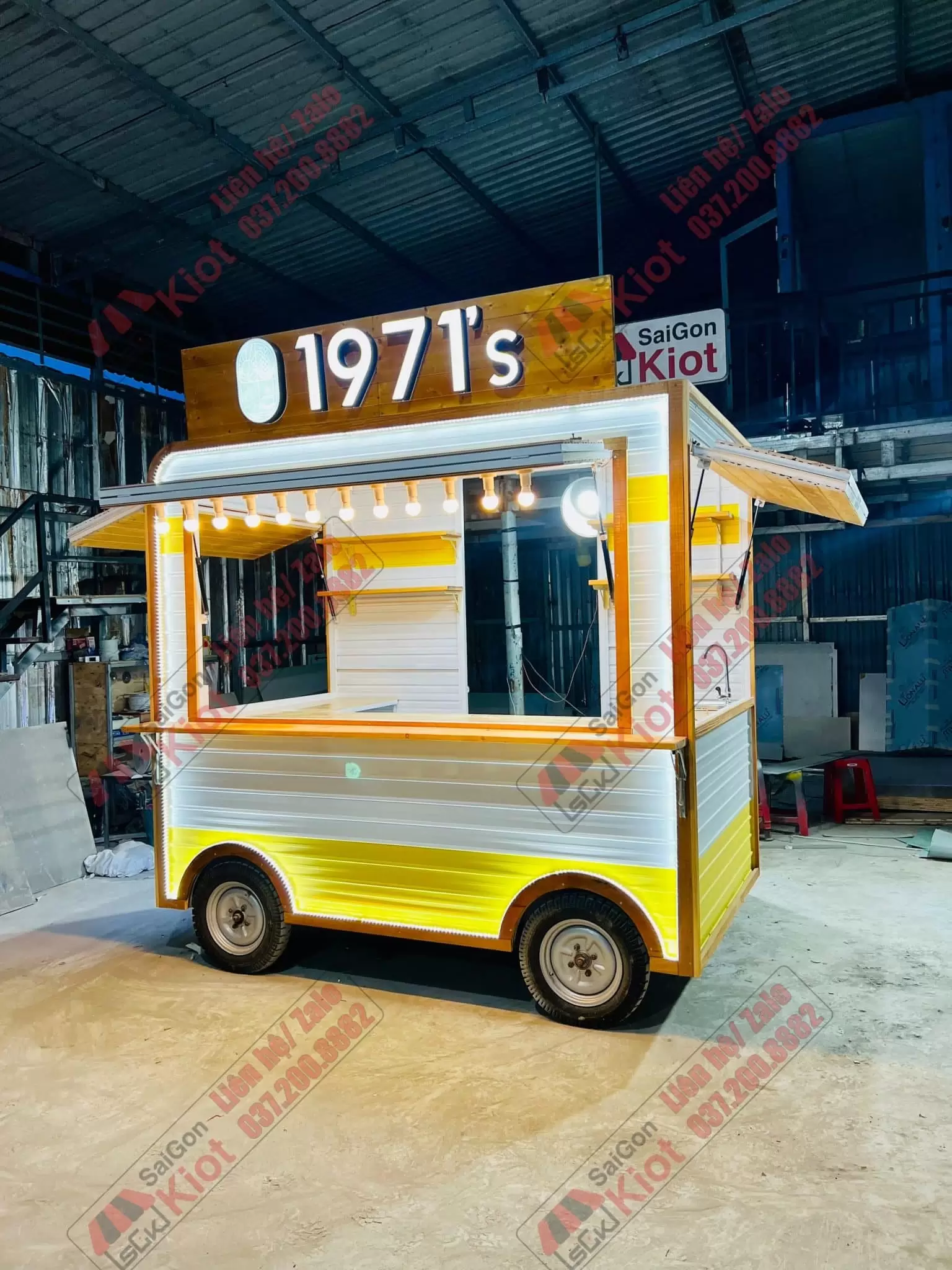– Ngang 2m50 – Rộng 1m50 – Cao 2m80 (cả bánh xe và bảng hiệu)