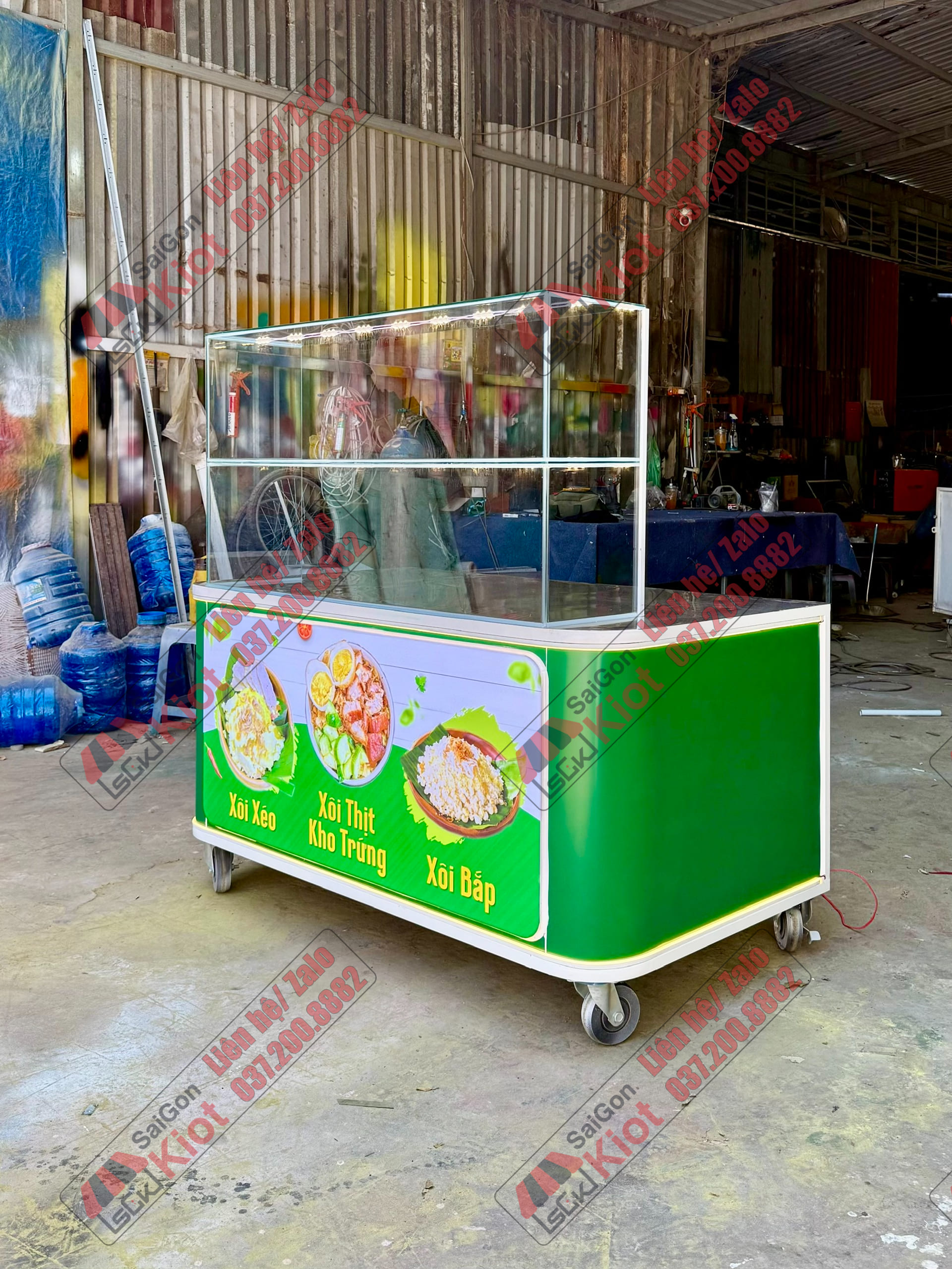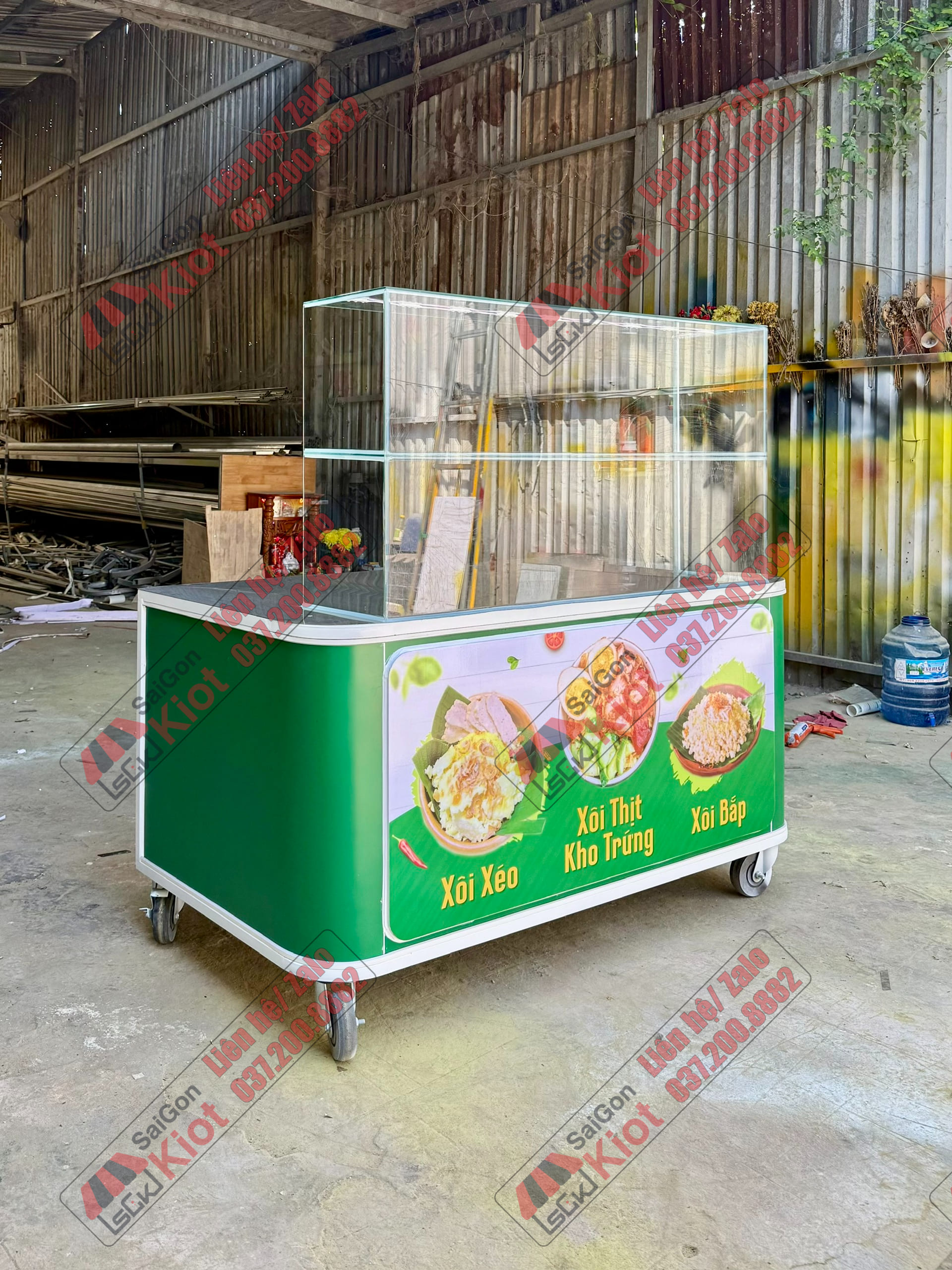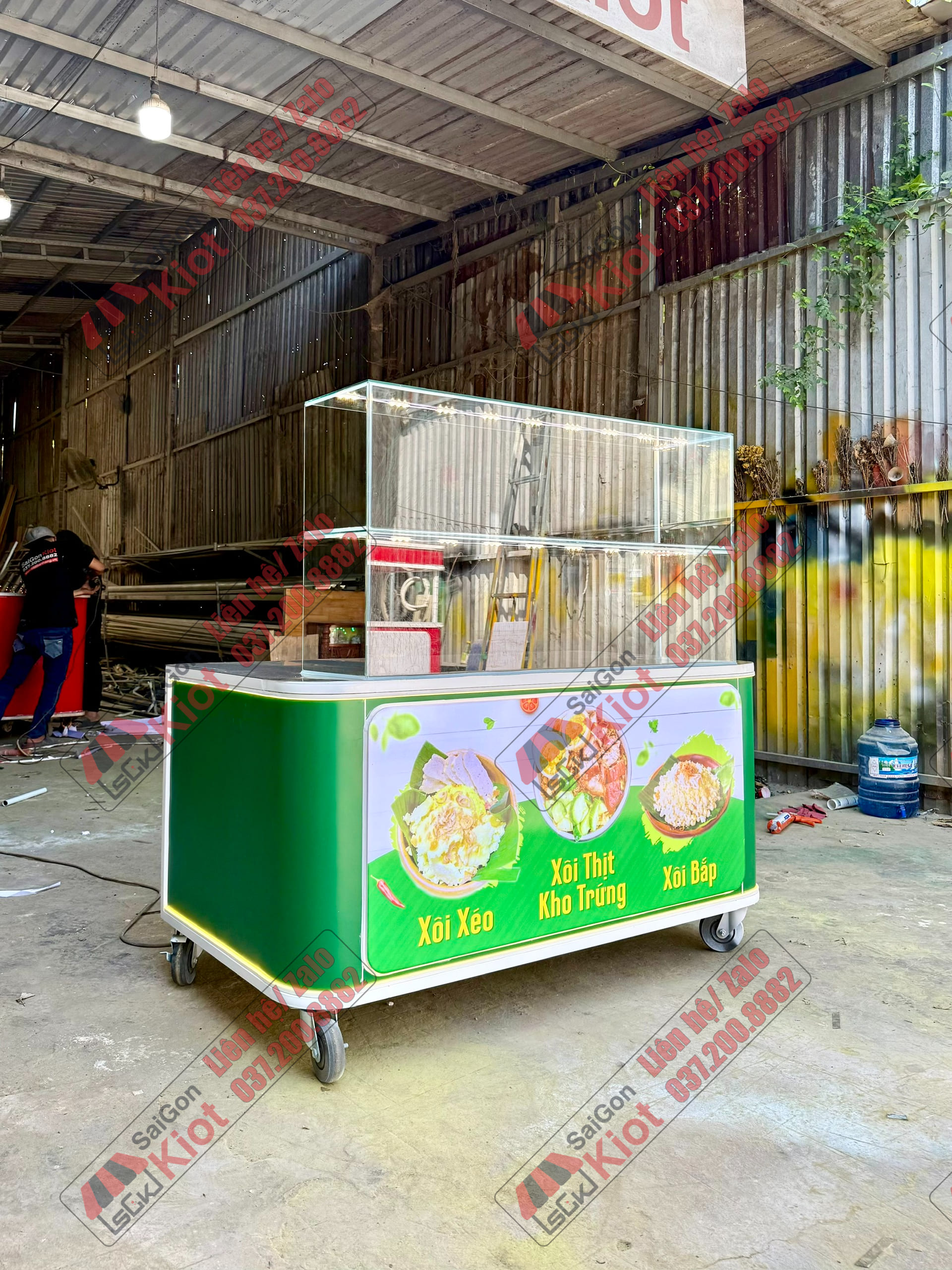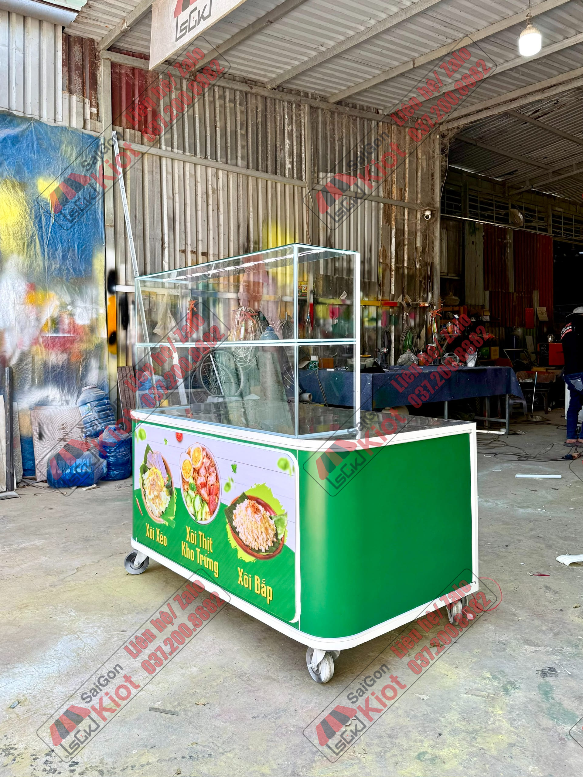 Quầy bán xôi màu xanh nhỏ gọn và tiện nghi