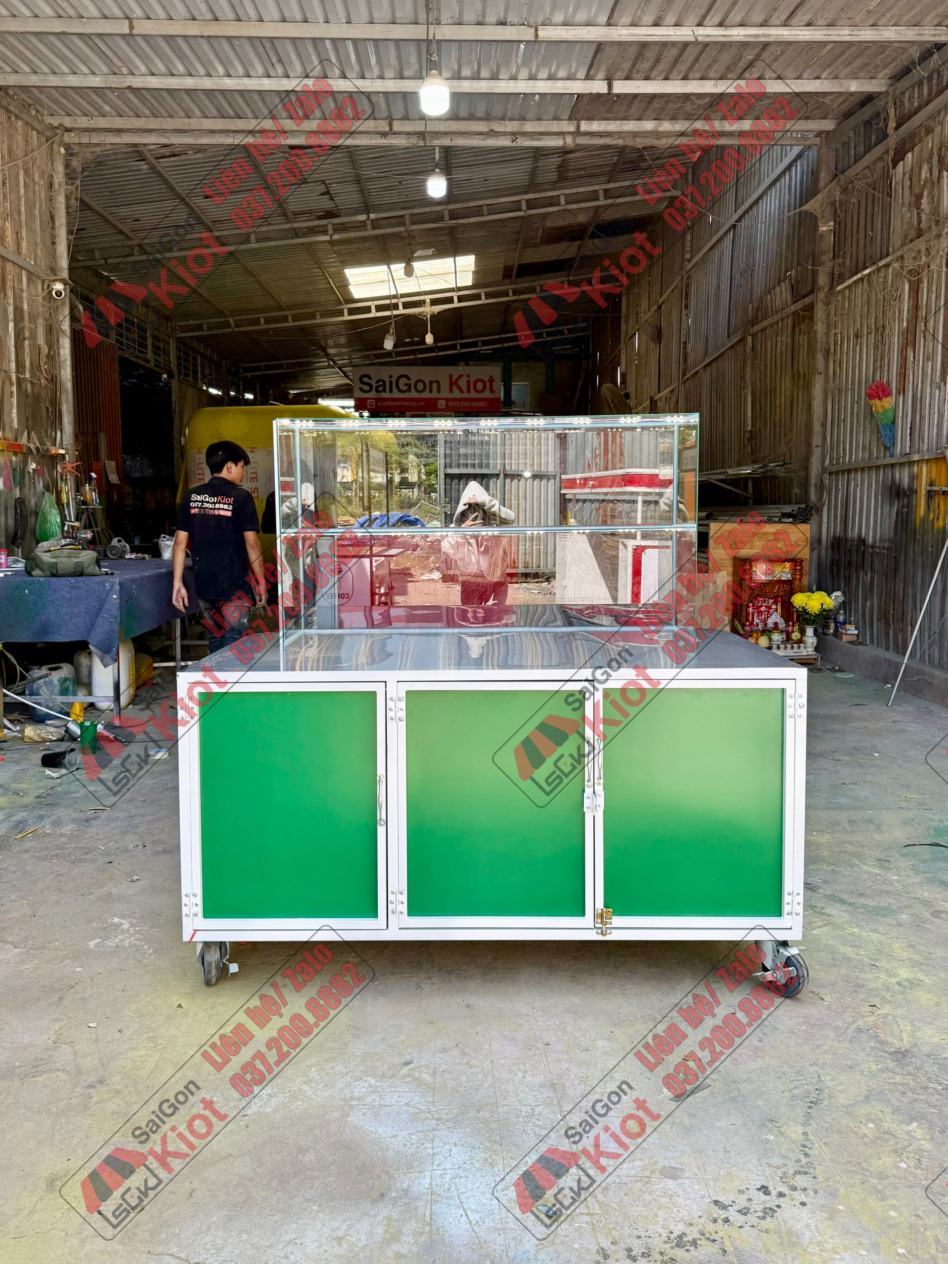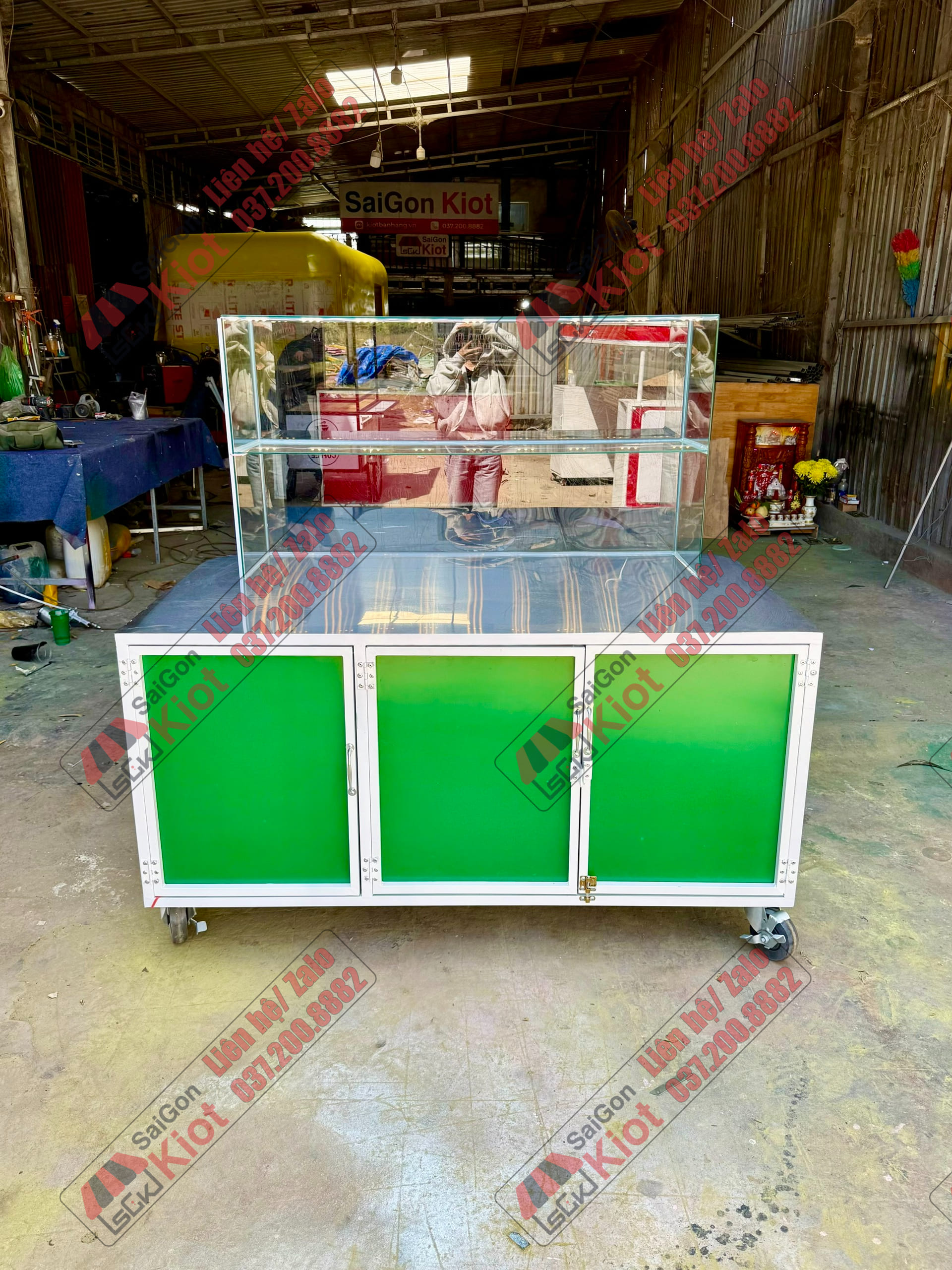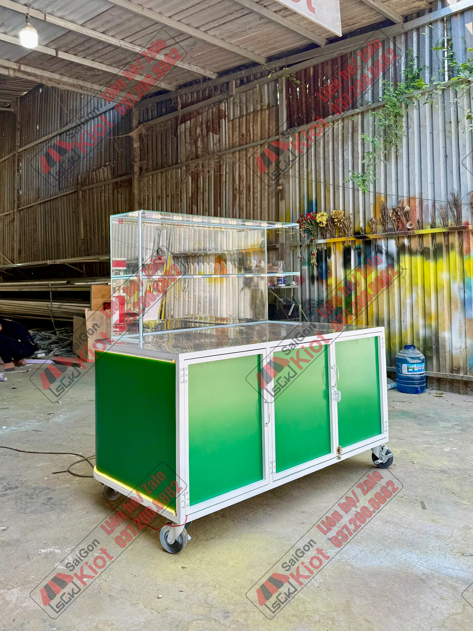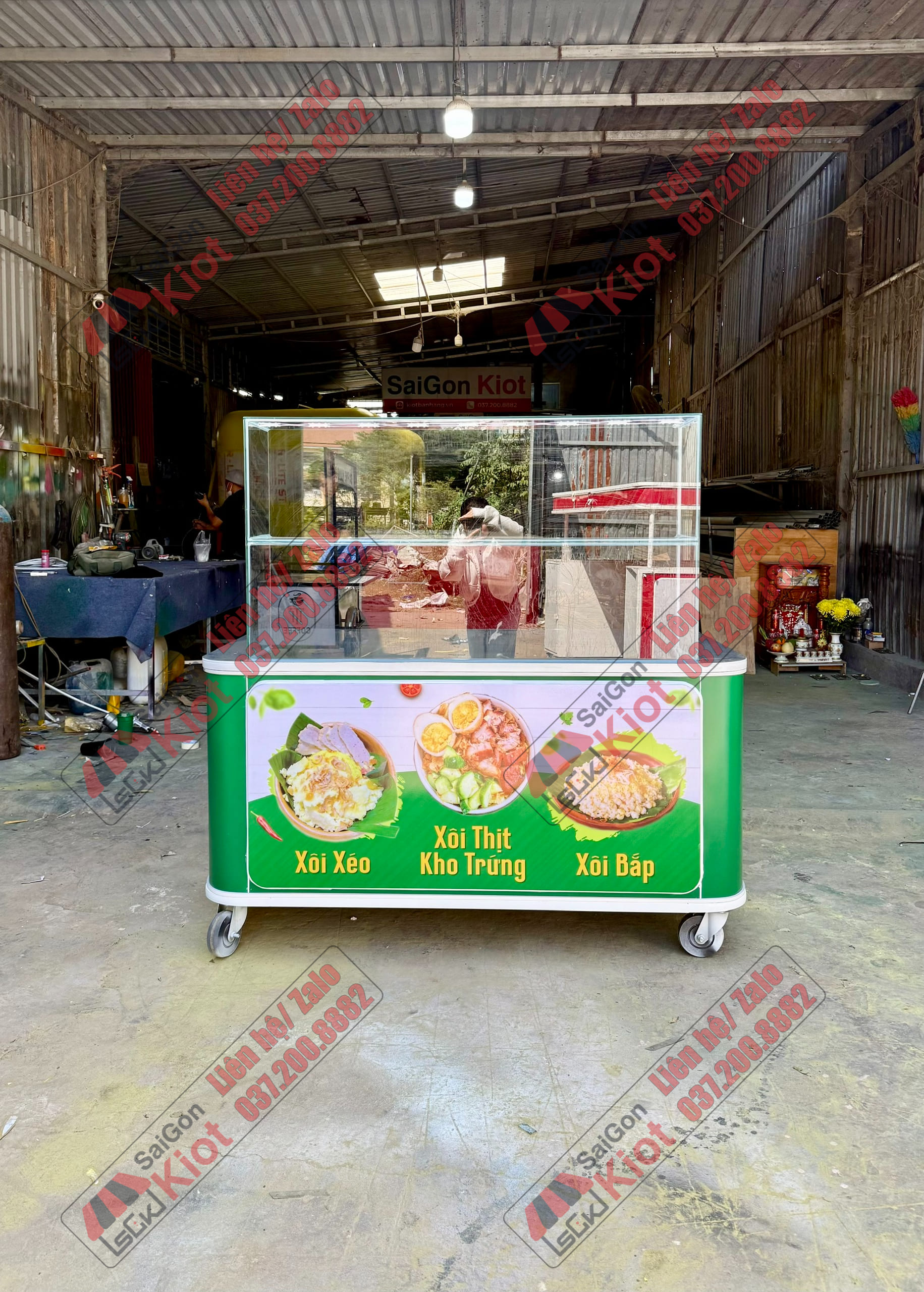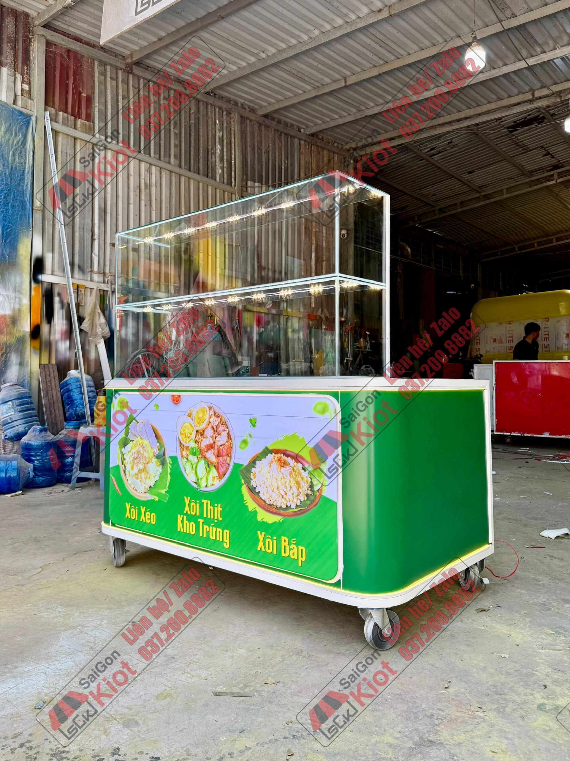 Quầy bán xôi màu xanh nhỏ gọn và tiện nghi