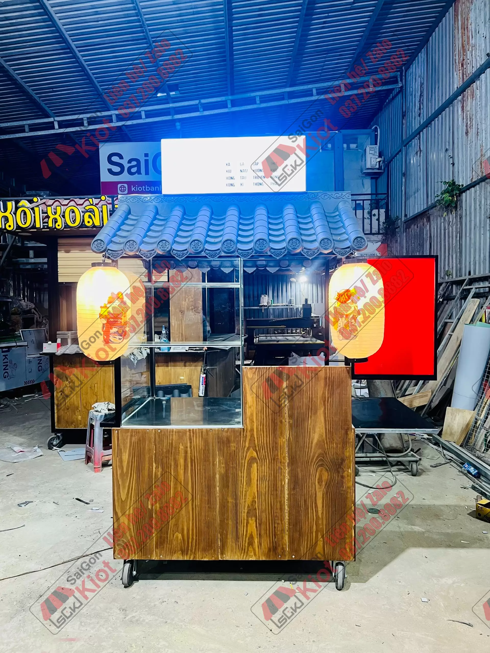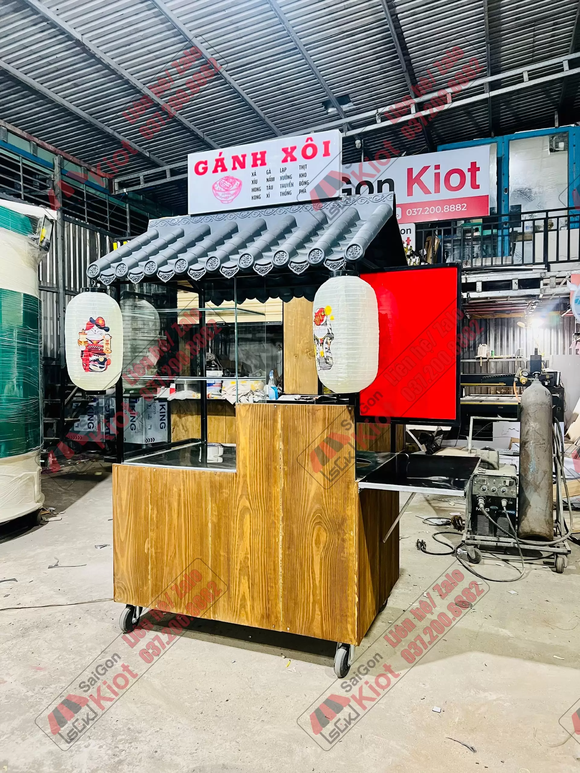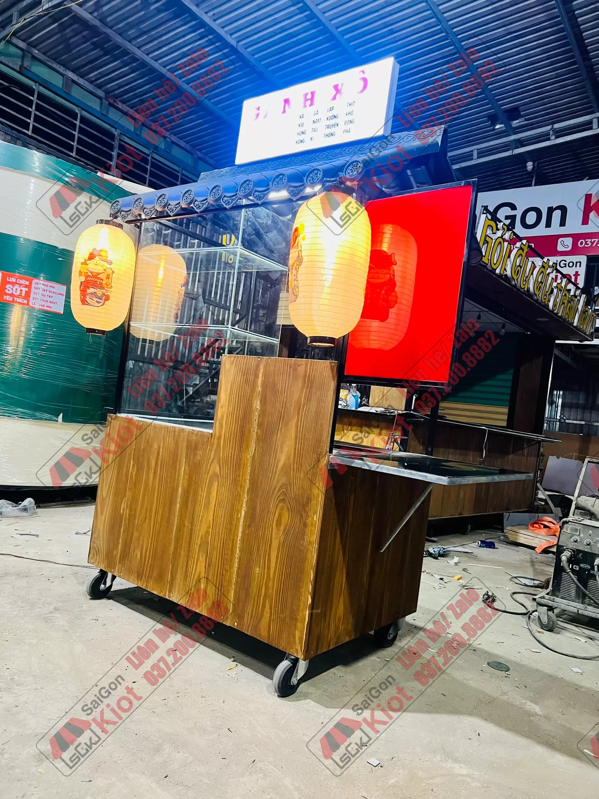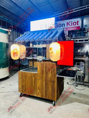 – Ngang 1m20 – Rộng 80cm – Cao 2m30 (cả bánh xe và bảng hiệu)